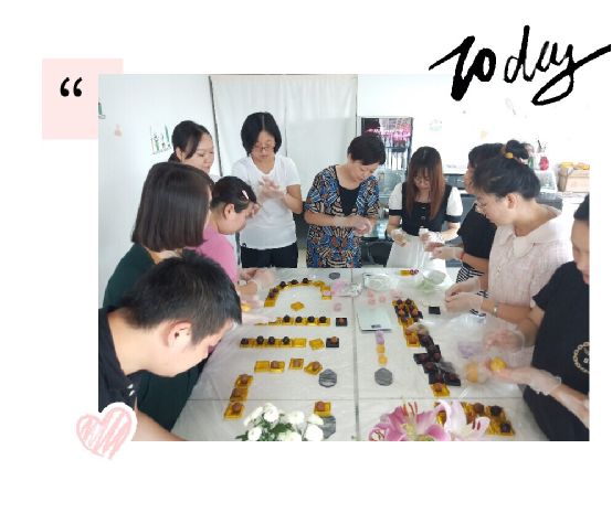 大家根据网上教程按照一揉二包三按的程序开始忙碌起来,有认真按比例配水揉面粉的、有盯着电子秤把准馅料克数的、有一丝不苟搓馅料团子的......待原材料备齐,大家分别挑选自己喜欢的馅料口味进行皮包馅,把包好的冰皮月饼雏形放入模具中,轻轻按压即可成型脱模。两个小时的DIY后,餐桌上已经布满了五彩斑斓、图案精美的冰皮月饼,有白色的莲蓉味、金色的奶黄味、黄色的肉松味、红色的红豆味,看着亲手制作的团圆饼,大家开始美拍晒照,展示自己的劳动成果。